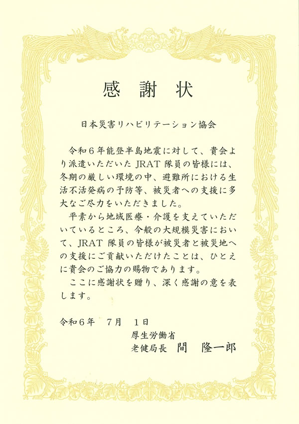 独立行政法人福祉医療機構(WAM)助成(社会福祉振興助成事業)の特に優れた助成事業として、JRAT※の「災害リハビリコーディネーター養成事業」が選出されました。詳細は下記リンクよりご覧ください。 詳しくはこちら (※助成主体を日本リハビリテーション病院・施設協会として申請し、構成12団体の共同事業として実施しました)